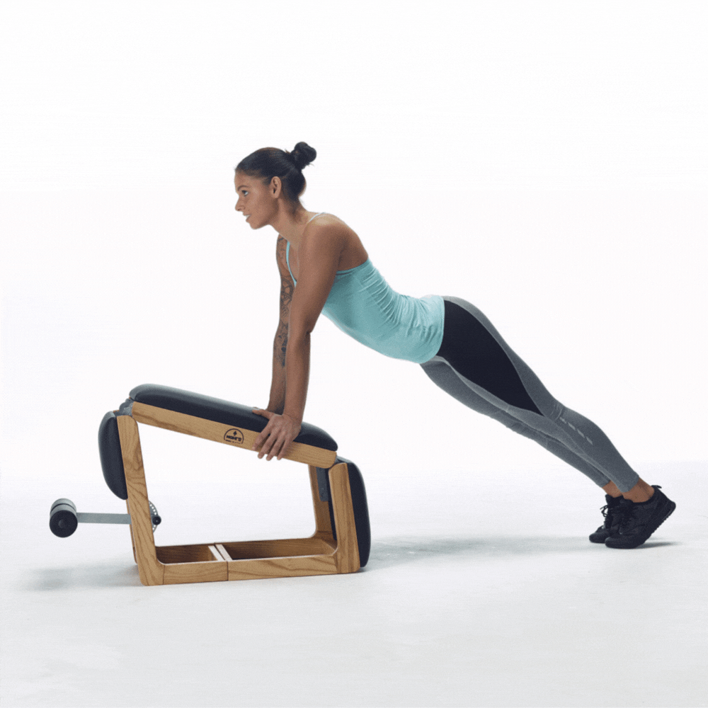 Tria Trainer is where contemporary, minimalistic design meets variety! This best describes the unique TriaTrainer. In a closed position the TriaTrainer serves as the perfect abs and core trainer. Unfold one side into first position and convert the chair into a semi-bench for working your back muscles and glutes.