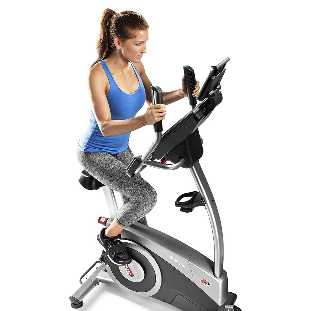 Comfort Features; The ProForm 8.0 EX smart exercise bike is designed for your comfort and includes extra-wide pedals with adjustable foot straps, oversized levelers, and an oversized cushioned seat